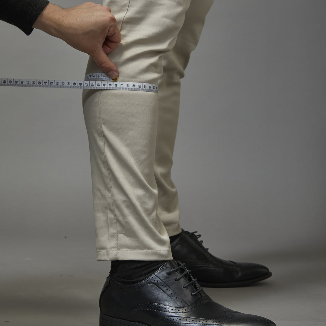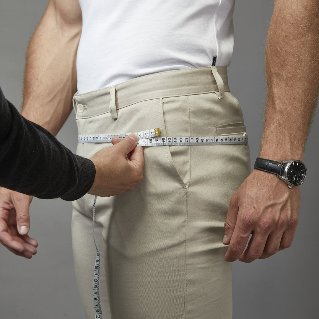 Measure from the top of the waistband in a straight line and down to the floor with shoes on and let us know exactly where you would like the trousers to stop (we recommend 4-6cm away from the floor depending on preference).
