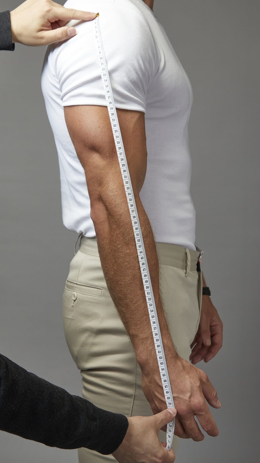 Using the same bone on the shoulder, run the tape in a straight line to middle knuckle, keeping your arm relaxed. We’ll then deduct 5cm to make sure the your sleeve stops in the right place.
